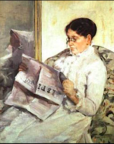 An 1878 oil on canvas, Reading Le Figaro, by Mary Cassatt (1844-1926), the American impressionist painter. The choice of newspaper, one usually read by men in this period, indicates the artists' intention to show the model, her mother, as someone who was not a traditional female figure but someone with advanced views on what women should concern themselves with. The mirror on the right is a nod to traditional portraitists who frequently used the device to show another side of the subject, but here Cassatt chooses not to do that and to only show the reflection of the newspaper, emphasising its importance in revealing her mother's character. (Private Collection)