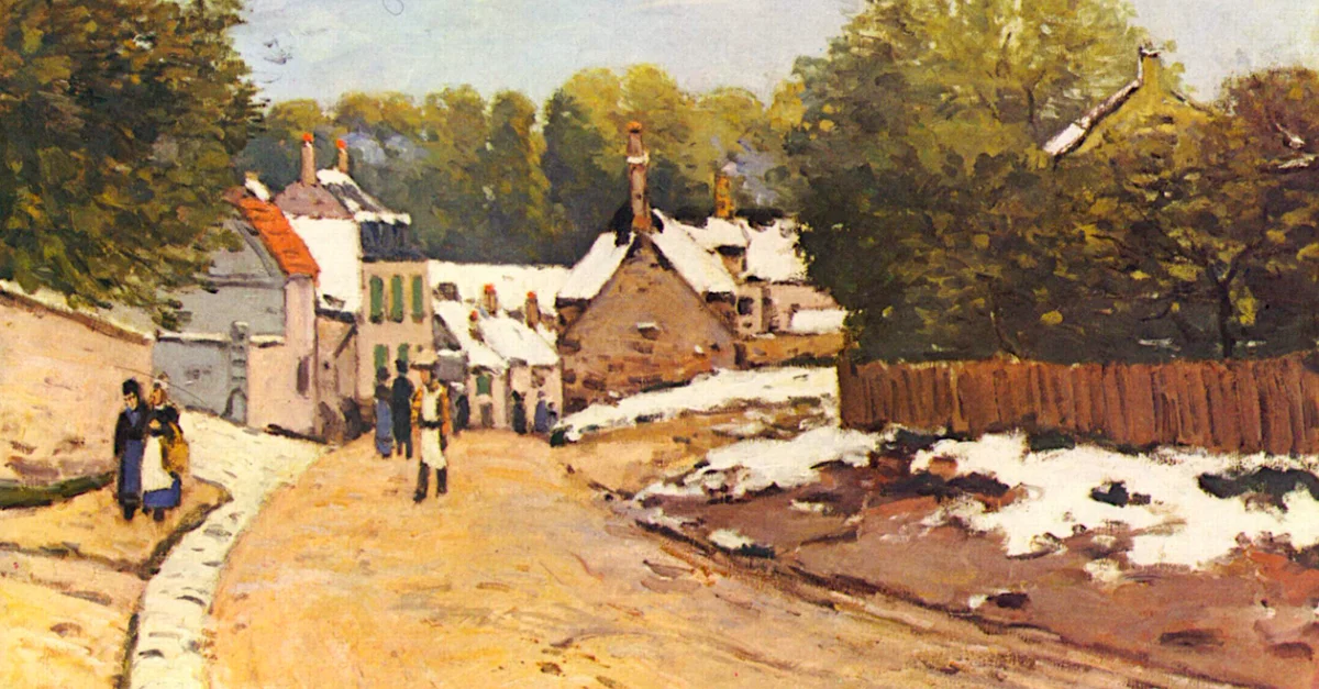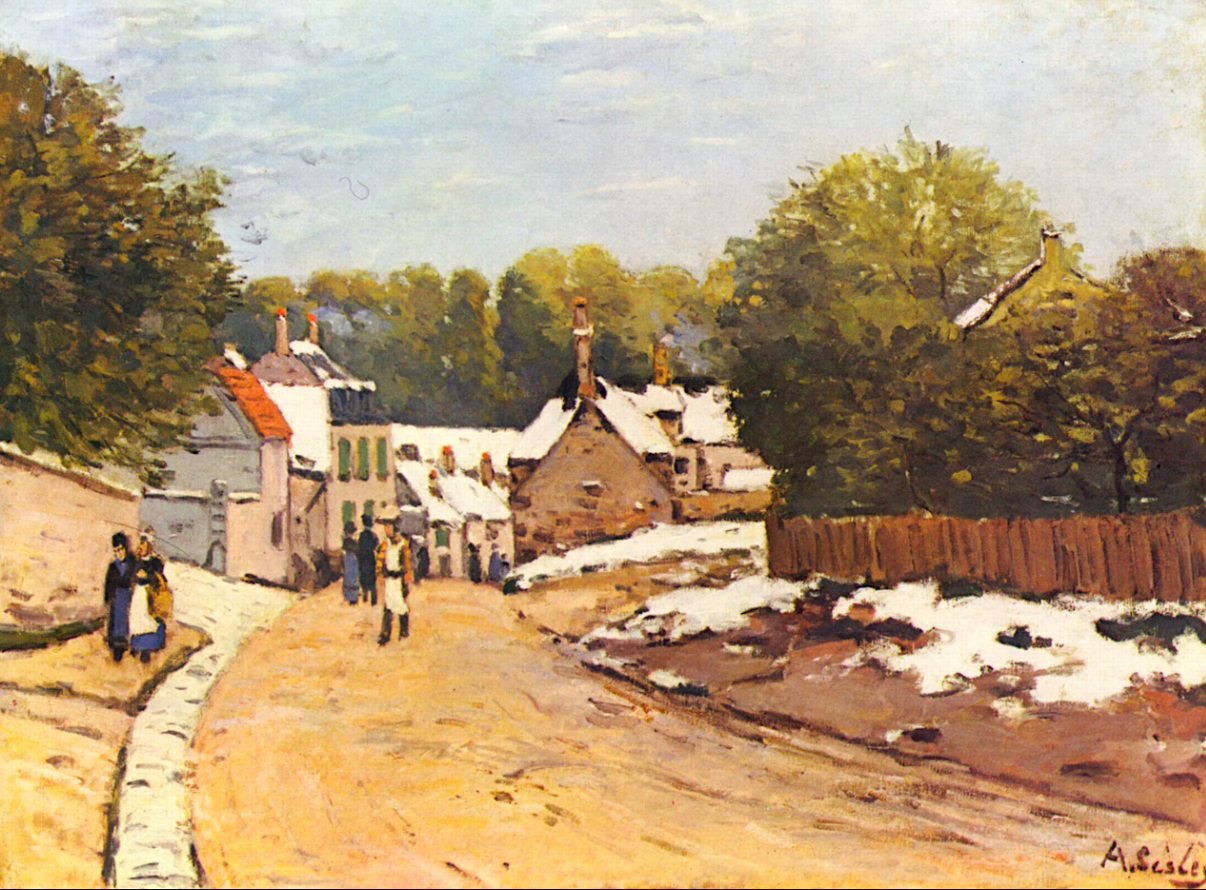 A c. 1871 oil on canvas, Early Snow at Louveciennes, by Alfred Sisley (1839-1899), the Franco-British impressionist painter. Sisley worked with Camille Pissarro (1830-1903) at Louveciennes near Paris, and the influence on Sisley is clear in the composition of this landscape. (Museum of Fine Arts, Boston)