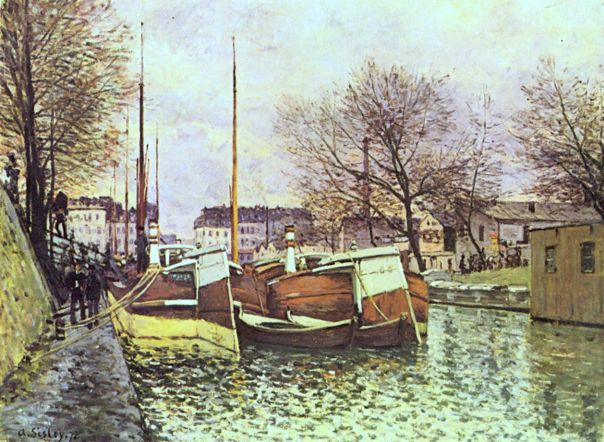 An 1870 oil on canvas, Barges on the Canal Saint-Martin, by Alfred Sisley (1839-1899), the Franco-British impressionist painter. (Oskar Reinhart Foundation, Winterthur, Switzerland)