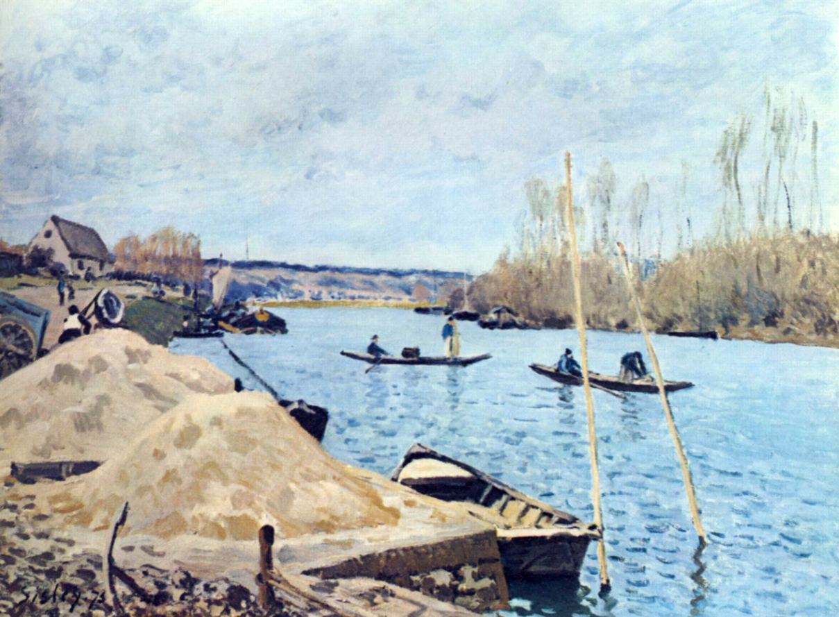 An 1875 oil on canvas, The Seine at Port-Marly, Piles of Sand, by Alfred Sisley (1839-1899), the Franco-British impressionist painter. This painting shows dredging activities on the Seine. (Art Institute of Chicago)