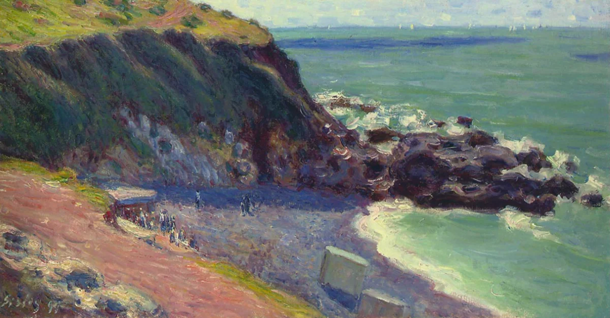 An 1897 oil on canvas, Lady's Cove, Langland Bay, by Alfred Sisley (1839-1899), the Franco-British impressionist painter. The artist painted a series of canvases with the cove and its rocks in all weather condtions. (Private Collection)