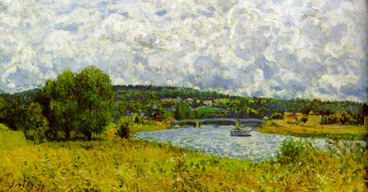 An 1877 oil on canvas, The Seine at Suresnes, by Alfred Sisley (1839-1899), the Franco-British impressionist painter. Sisley and the impressionists broke away from many conventions in art, one of which was to make a large portion of the canvas sky when in the past this had been restricted to a narrow band at the top of the painting. (Musée d'Orsay, Paris)