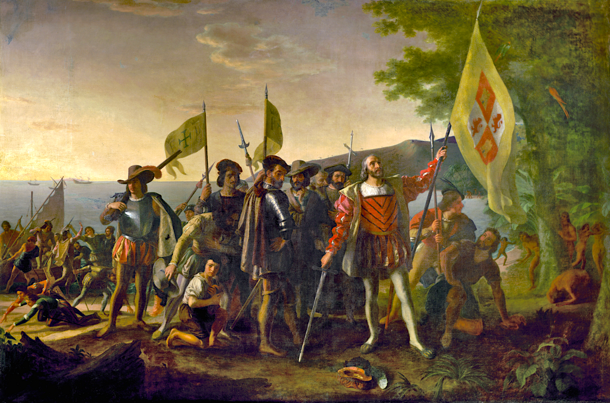 An 1847 painting by John Vanderlyn showing the landing of Christopher Columbus (1451-1506 CE) in the West Indies in 1492. As an adelantado, Columbus was representing the Spanish Crown, hence he holds a banner showing the Spanish coats of arms.