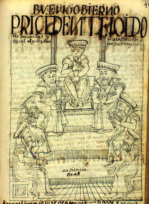 A 1615 illustration showing the members of the audiencia of Lima, Peru. The audiencia was an important element of local government, justice, and commerce in the major cities of the Spanish empire. (Royal Library, Copenhagen)