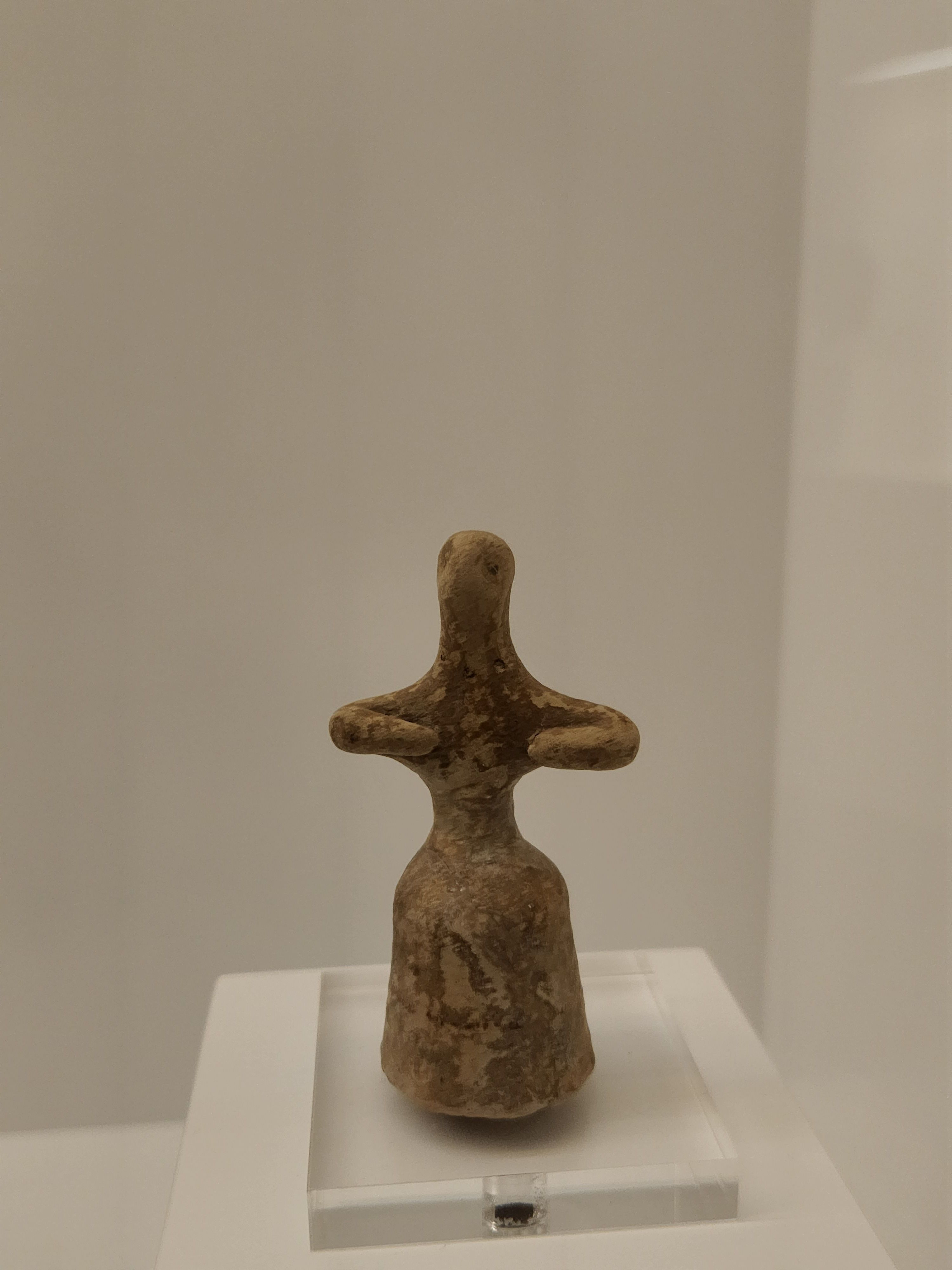 The figure is wearing a cylindrical skirt and is bringing her arms to her chest. Figurines of this type are known from Minoan shrines and are probably representing the Adorants.