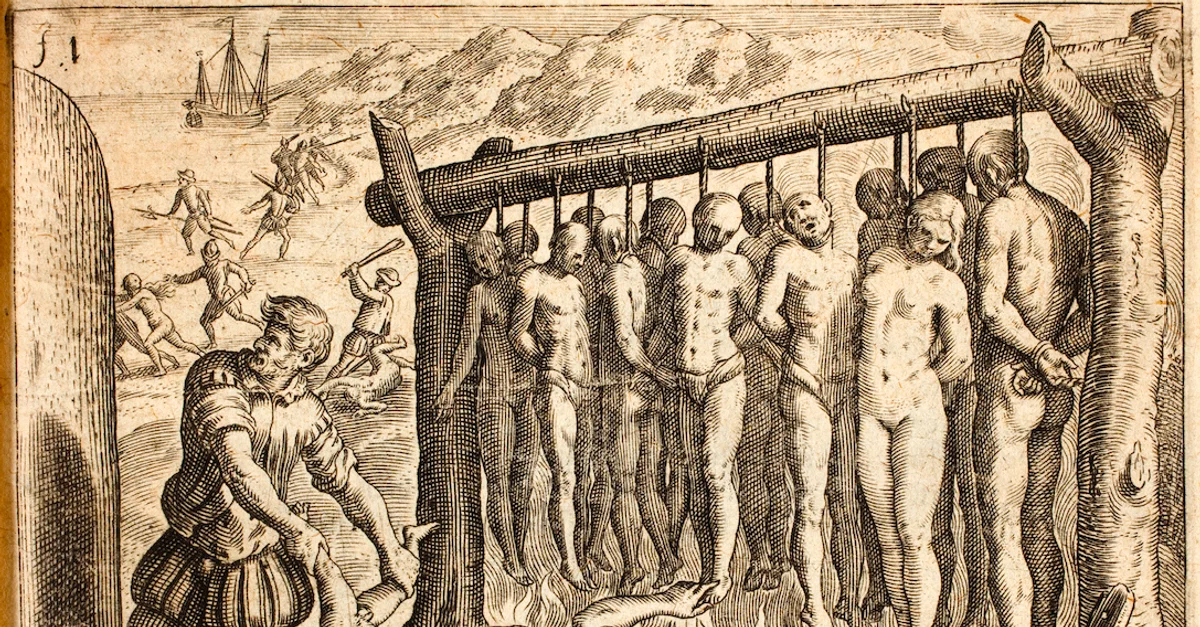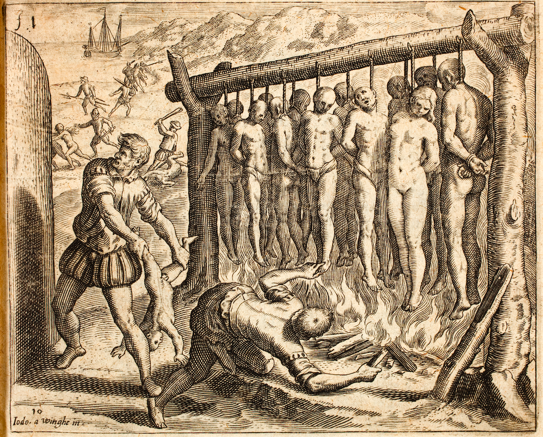 An illustration showing the torture of indigenous American peoples by Spanish conquistadors. From the 1552 edition of A Very Brief Recital of the Destruction of the Indies by Bartolomé de las Casas which was a graphic indictment of the exploitation of Americans within the Spanish Empire. (Peace Palace Library, The Hague)