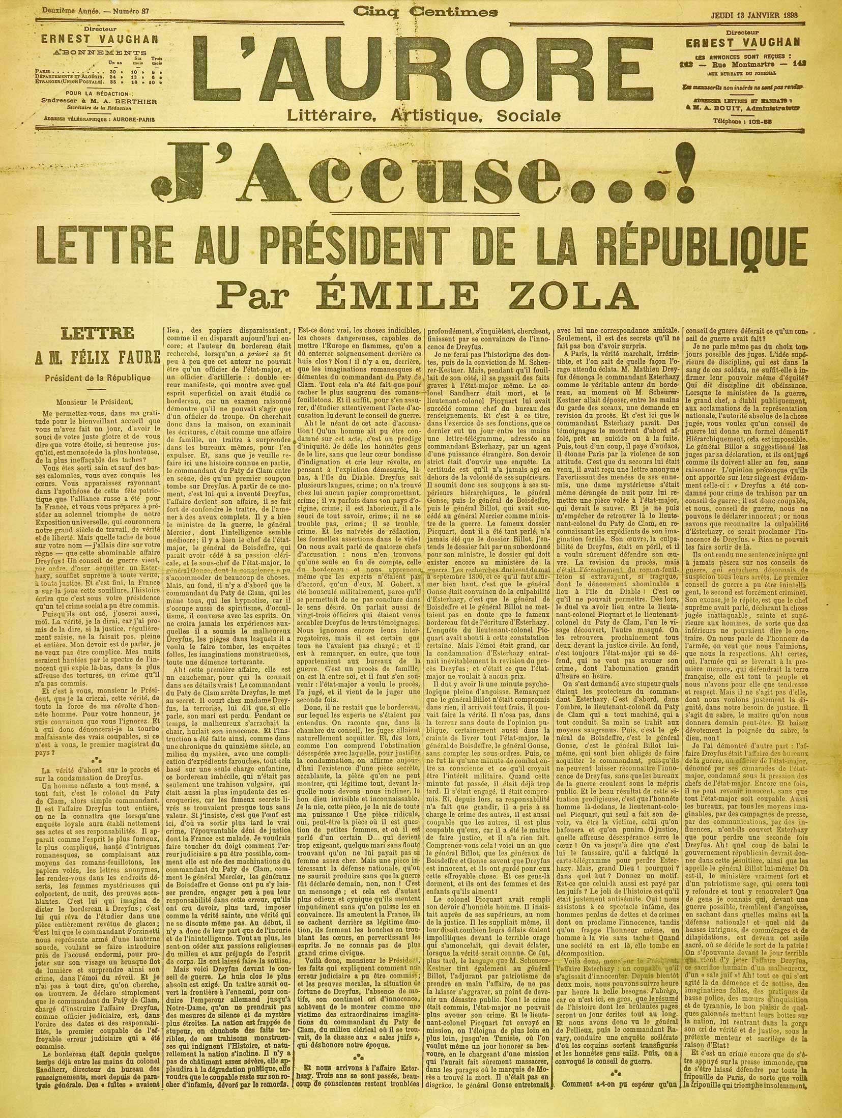 J'Accuse, open letter about the Dreyfus Affair by Émile Zola, published in L'Aurore, 13 January 1898.