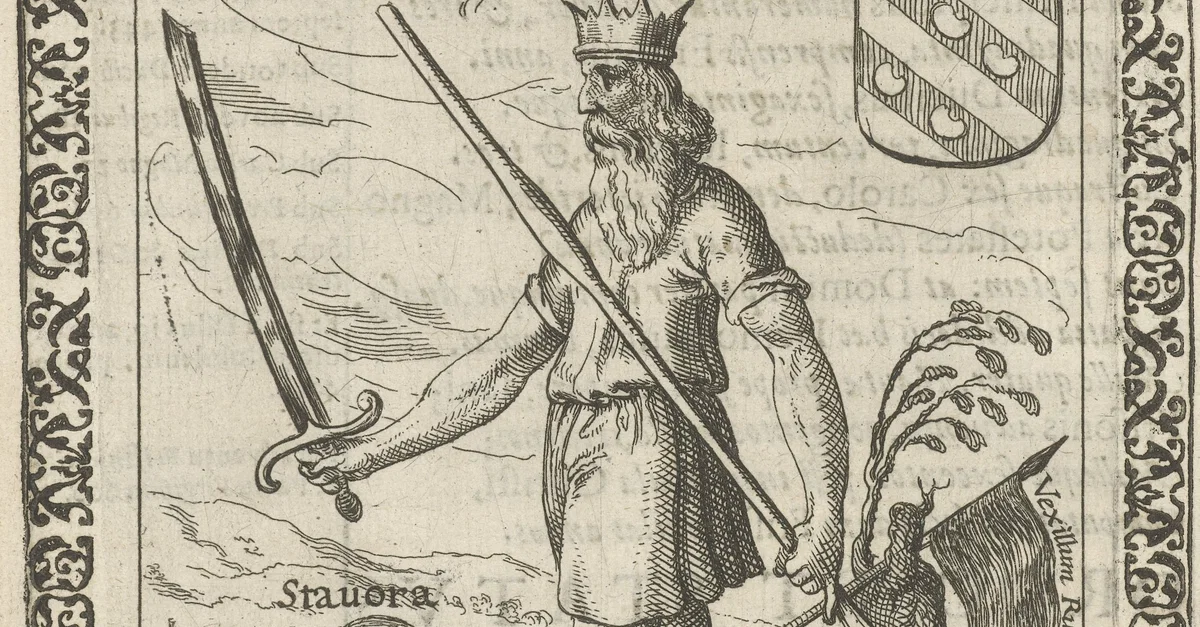 Friso, the legendary king of Frisia, holding a sword in the city of Stavoren, Frisia. Print by Pieter Feddes van Harlingen, 1618-1620.