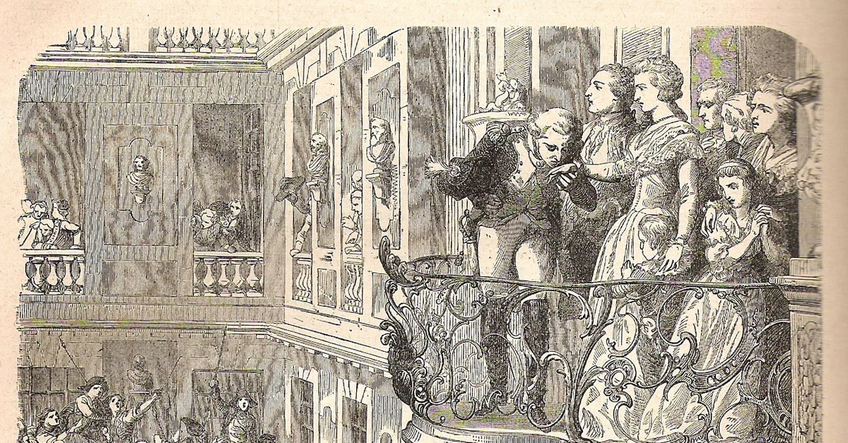 The Marquis de Lafayette kisses the hand of Queen Marie Antoinette of France following the Women's March on Versailles on 6 October 1789. An excellent showman, Lafayette always knew how to put on a performance to please the masses. Old engraving by an unknown artist, c. 18th century.