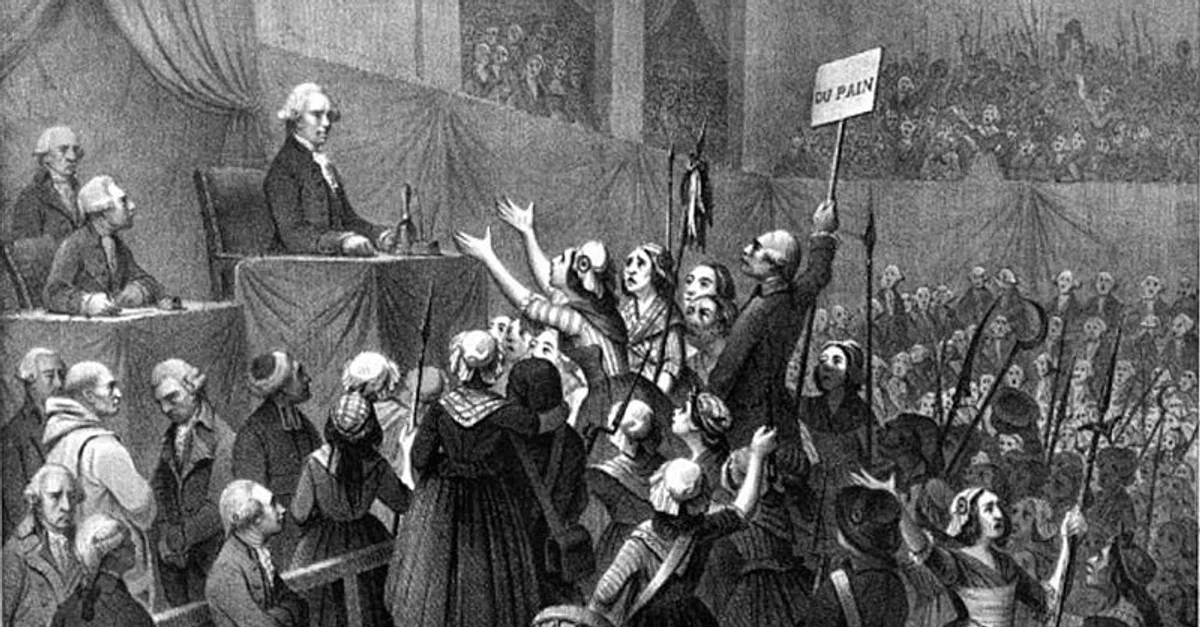 Women's March on Versailles, 5 October 1789. The National Assembly's president Jean-Joseph Mounier presides over a chatoic hall, with women marchers mingling with Assembly deputies. A man, probably Stanislas Maillard, holds a sign asking for bread.