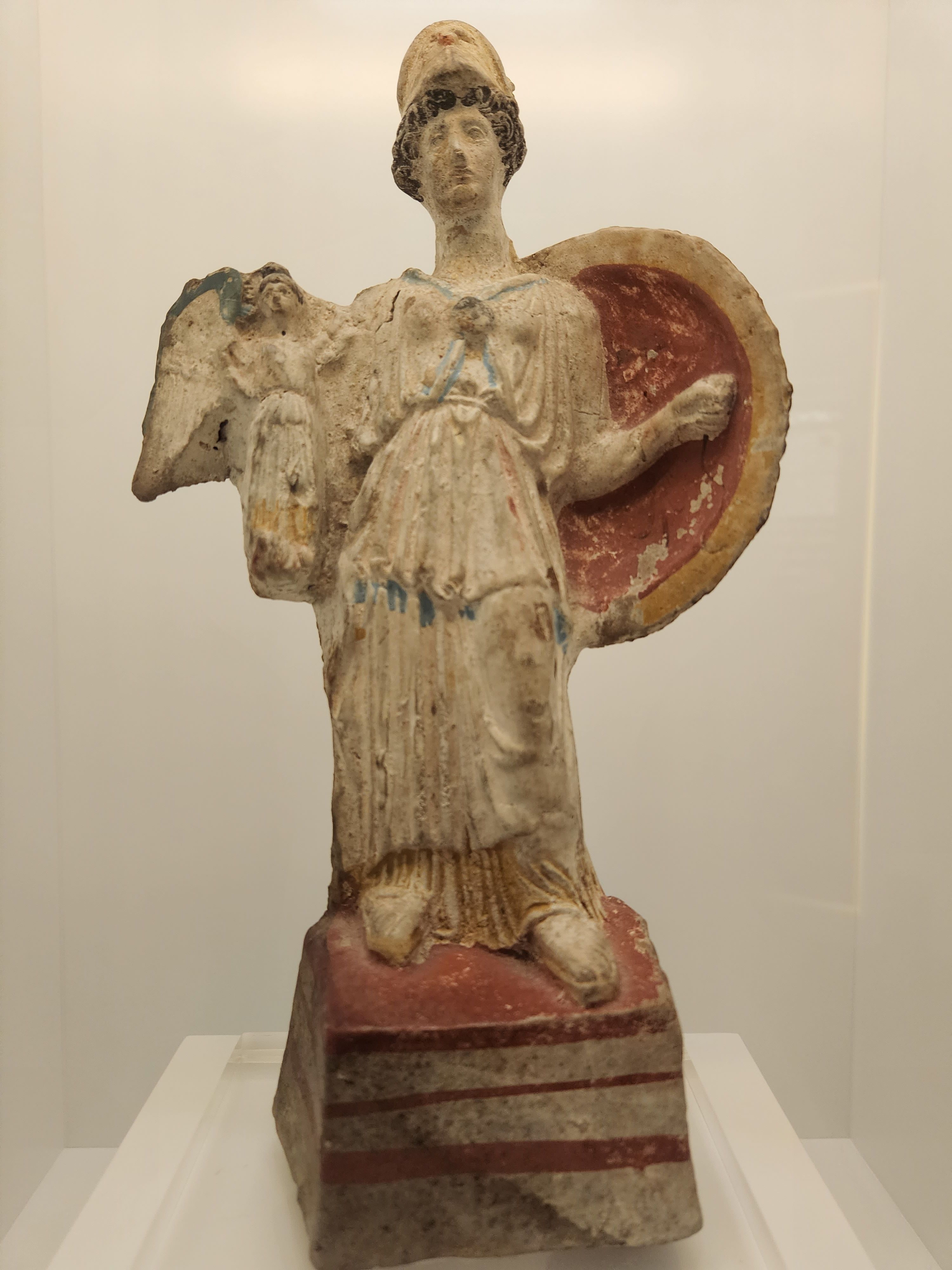 A rare polychromatic terracotta version of the chryselephantine statue of Athena Parthenos, which stood in the Parthenon and was a work of Pheidias, of the years 447/6-438 BCE.