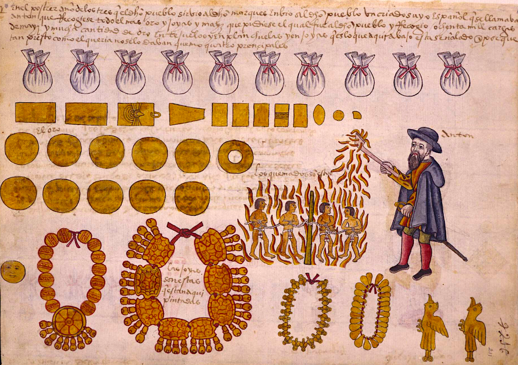 A page of the 1554 Codex Tepetlaoztoc showing the collection of gold tribute by Spanish colonial authorities in New Spain (Mexico). (British Museum, London)