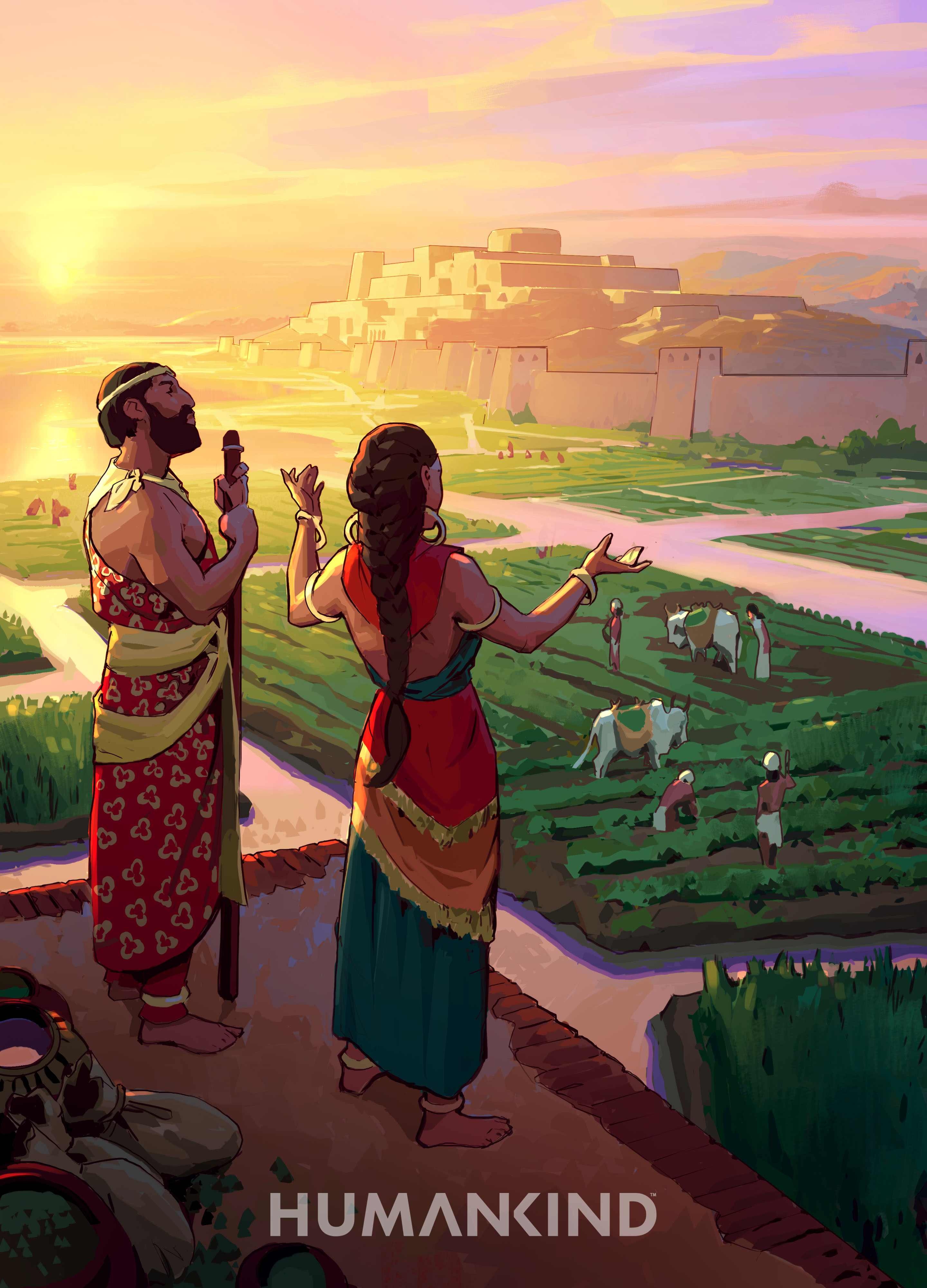 An artist's impression of Harappa and the Indus Valley Civilization, depicting fields and cities in ancient India. Created by Amplitude Studios for the video game Humankind.
