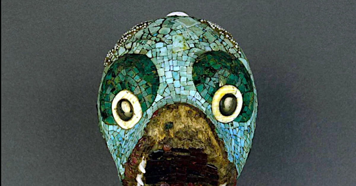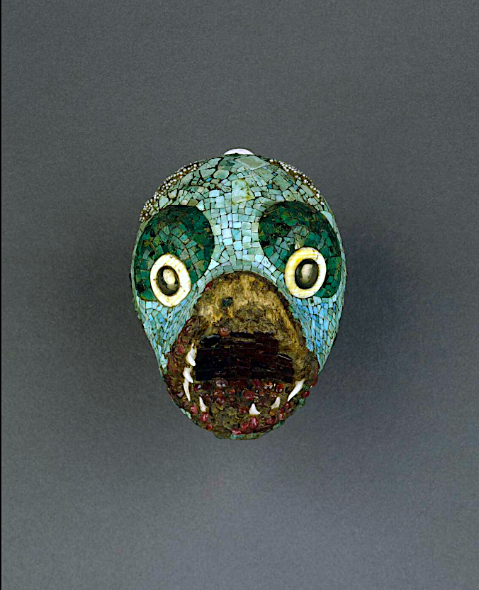 An Aztec pendant representing an animal head and covered in turquoise mosaic and with eyes rendered in shell and pyrite. 1400-1521, Mexico. Height 10 cm. (British Museum, London)
