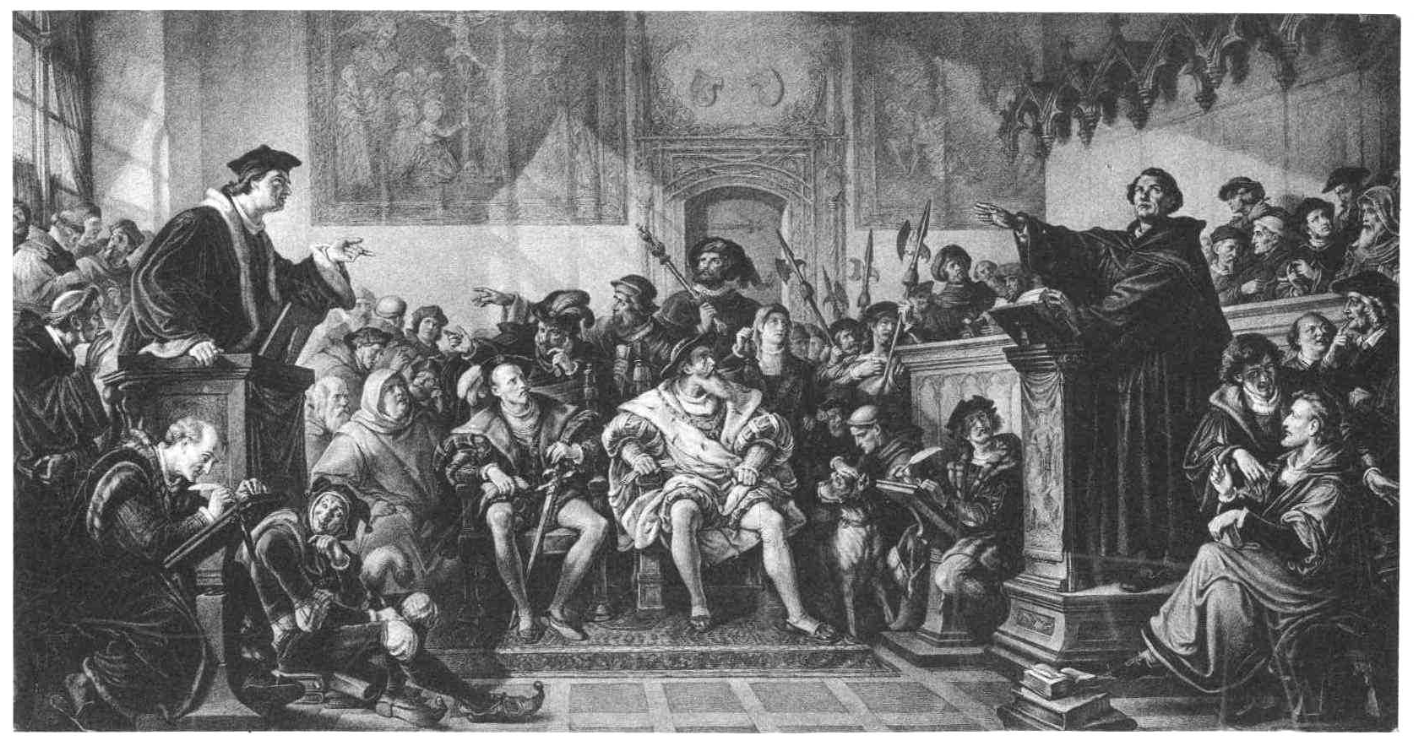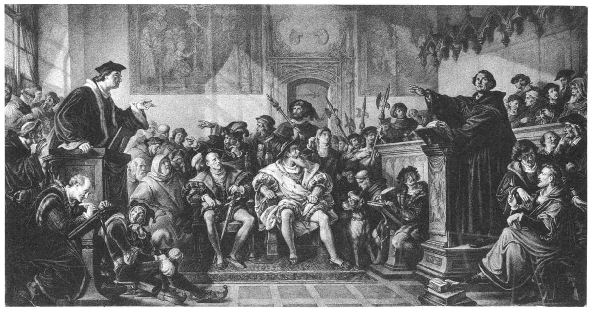 An early 19th-century illustration by Julius Hübner showing Johann Eck (l. 1486-1543), the Catholic theologian and writer, in his debate with Martin Luther (l. 1483-1546) at Leipzig in 1519. (Galerie Neue Meister, Dresden, Germany)