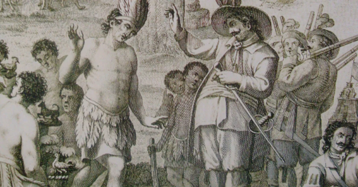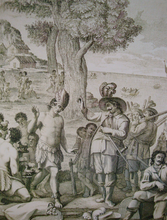 A detail of a mural showing Juan de Grijalva (1489-1527), the Spanish conquistador who explored the coast of Mexico in 1518, meeting a Maya chief on the Tabasco coast.