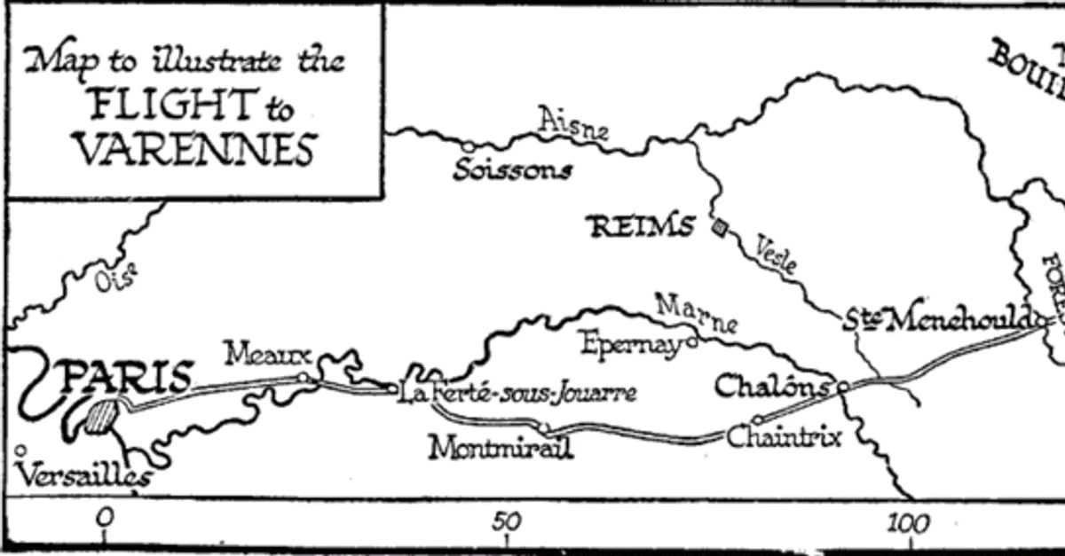 A map illustrating the route taken by King Louis XVI and his family during the failed escape from Paris known as the Flight to Varennes, on the night of 20-21 June 1791. The royal family was attempting to make it to Montmedy, on the border of the Austrian Netherlands, but was stopped and arrested at the town of Varennes-en-Argonne. From The Outline of History (New York, NY: The Macmillan Company, 1921) page 867, by H.G. Wells.