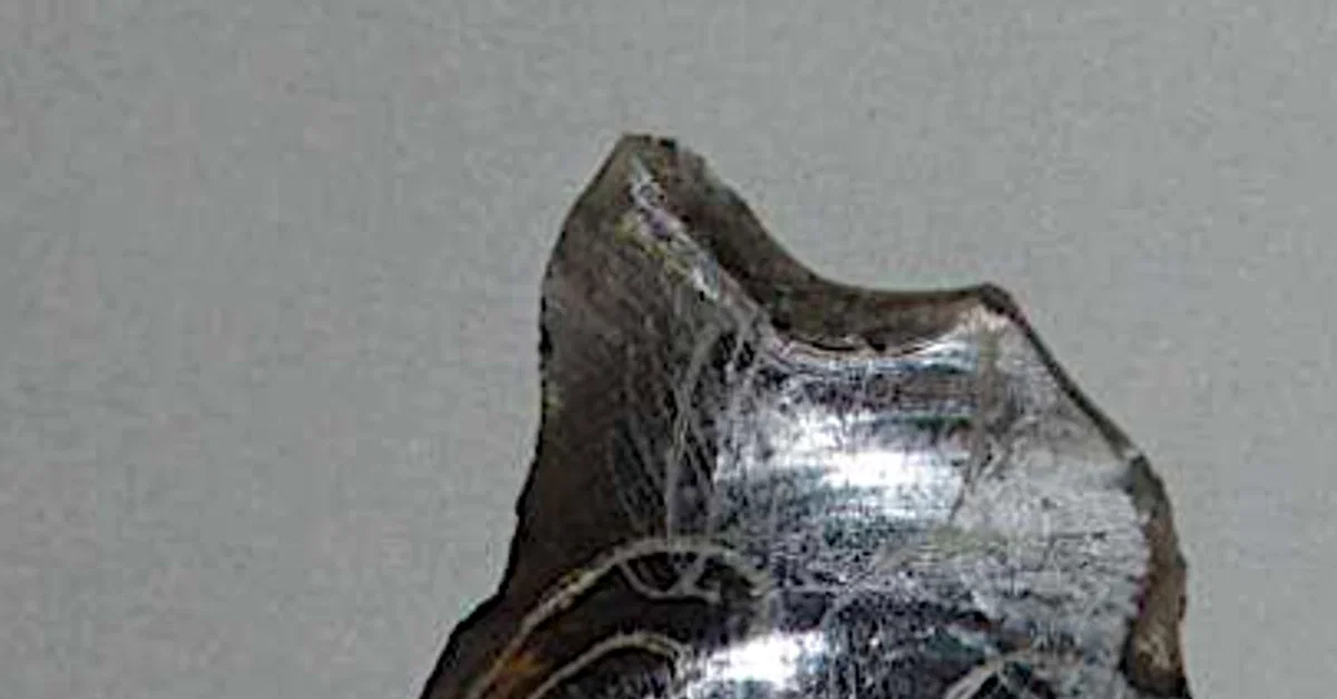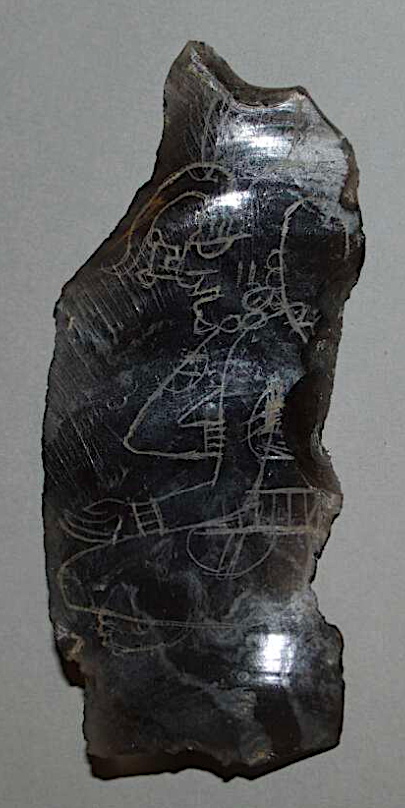 An obsidian flake from Tikal, Guatemala which has been incised with a representation of a Maya god. Height: 9 cm / 3.5 in. 250-900 CE. (British Museum, London)