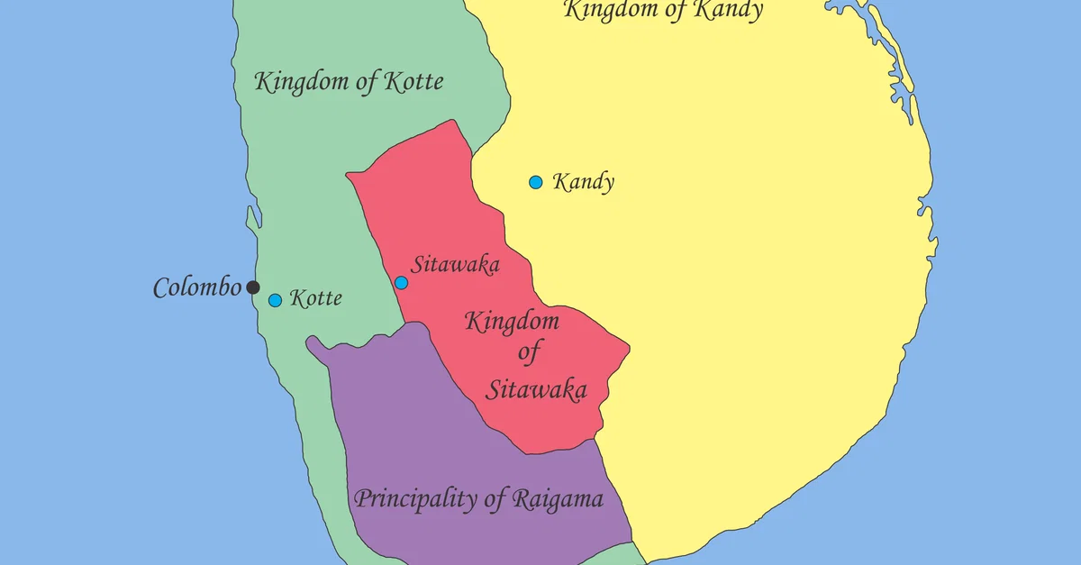 Map showing the geopolitical situation in Sri Lanka in the early part of the 16th century after the "Spoiling of Vijayabahu" in 1521.