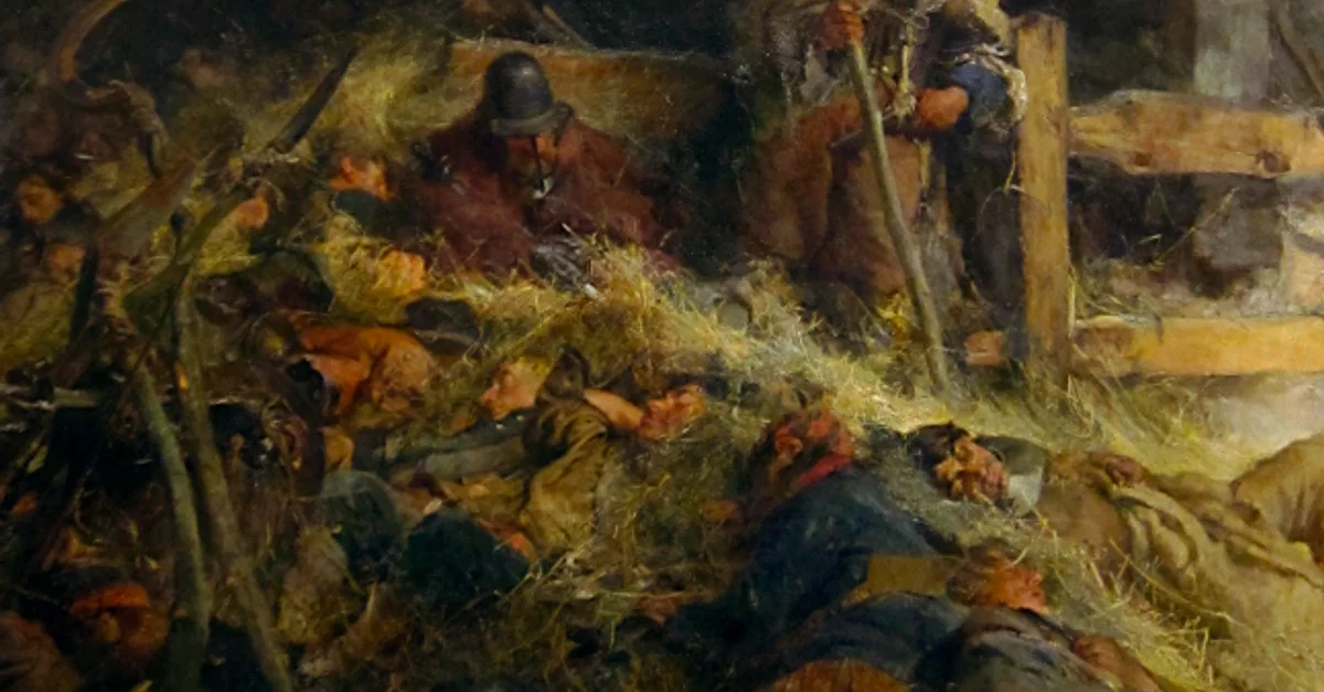 A 1905 oil on canvas painting by Edgar Bundy, 'The Morning of Sedgemoor'. The scene shows the poorly-equipped soldiers of the ramshackle army led by the Duke of Monmouth at the battle of Sedgemoor in July 1685. This battle, the main action of the Monmouth Rebellion, resulted in defeat for Monmouth and so ended his attempt to take the throne from James II of England. (Tate Britain)
