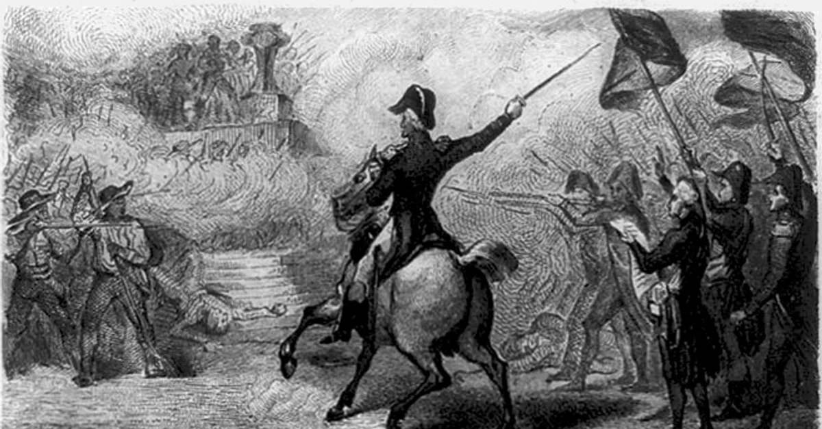 Marquis de Lafayette, seated upon a white charger, orders his soldiers to fire on the demonstrators gathered on the Champ de Mars to petition for the removal of the king, under the leadership of the radical Cordeliers Club. Work by Ary Scheffer, c. 1807.