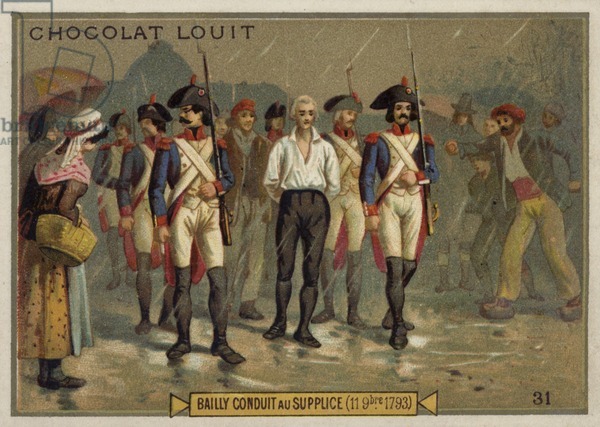 Jean Sylvain Bailly, former mayor of Paris, being led to his execution by guillotine on 11 November 1793, primarily for his role in the Champ de Mars Massacre. This illsutration is by an unknown author from the 19th century.