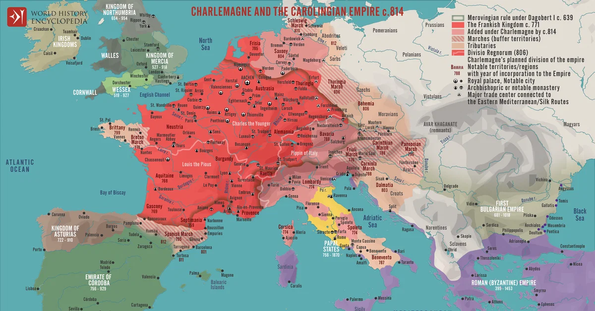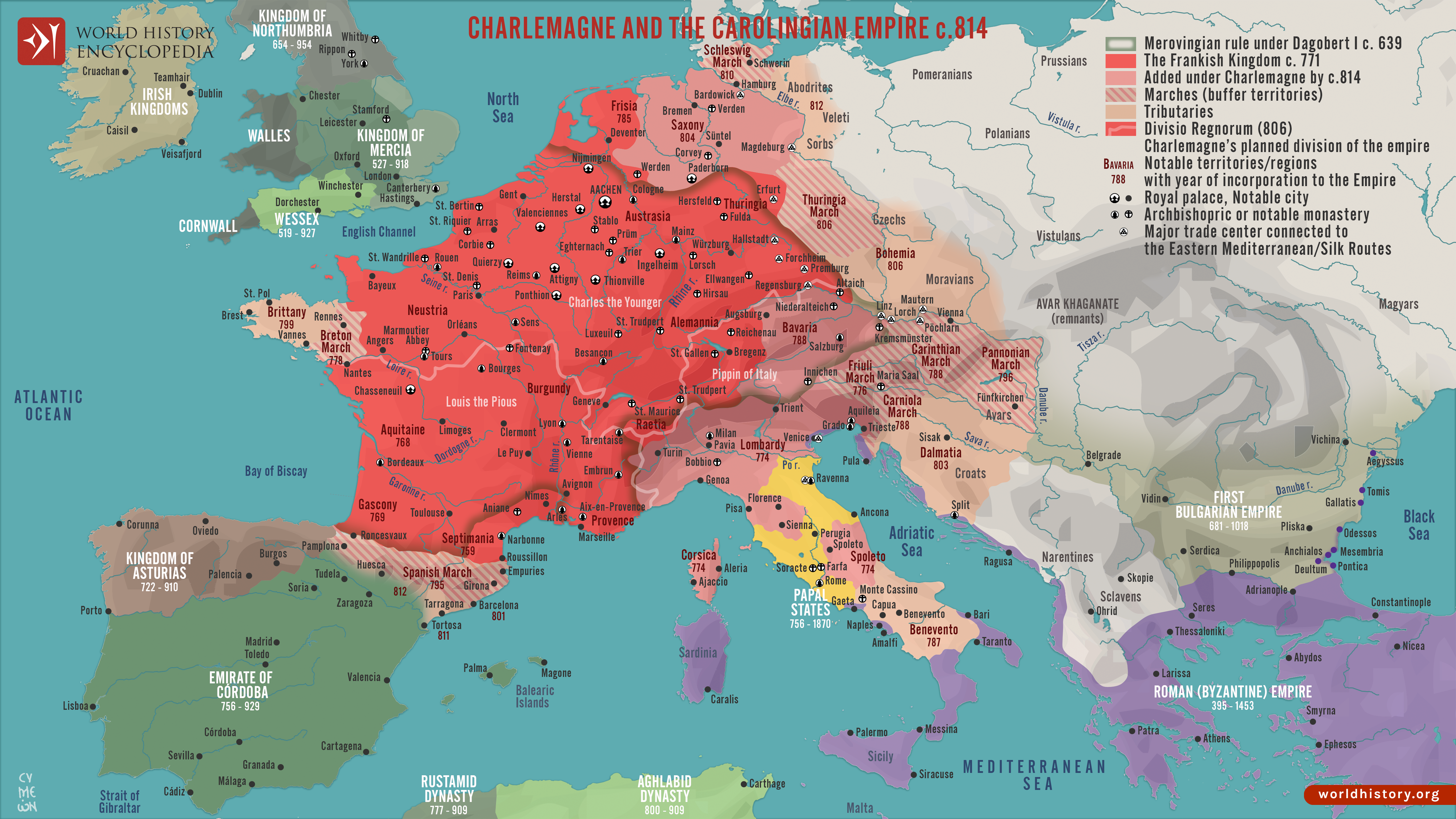 Netchev, S. (2022, September 09). Map of the Carolingian Empire under Charlemagne, c. 814. World History Encyclopedia. https://www.worldhistory.org/image/16359/map-of-the-carolingian-empire-under-charlemagne-c/