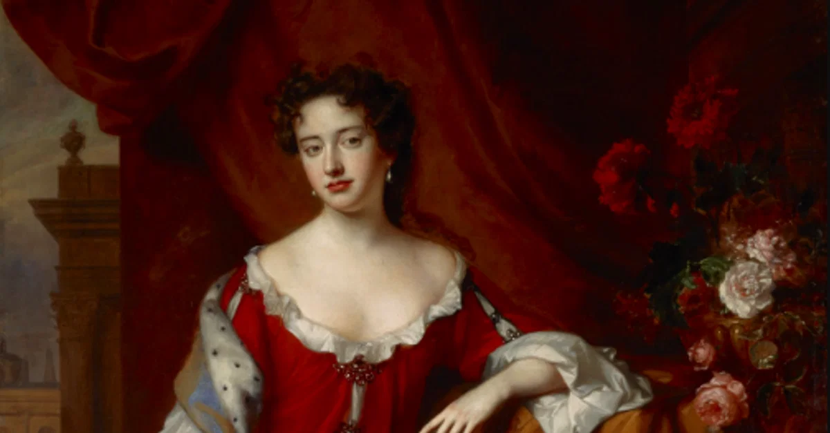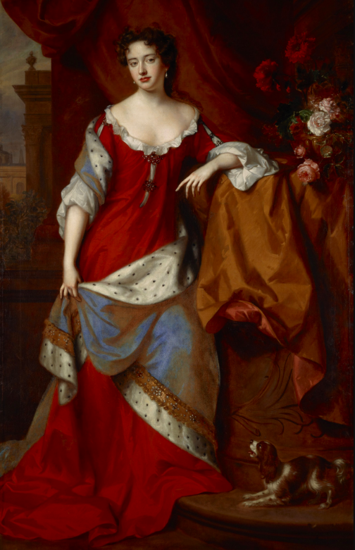 A c. 1685 oil-on-canvas portrait of Anne, Queen of Great Britain (r. 1702-1714) when she was Princess of Denmark. Painting by Jan van der Vaart and Willem Wissing. The princess is here 18 years of age and is enveloped in luxurious textiles.