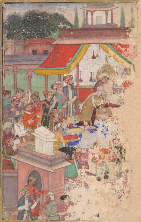 The court of the Mughal emperor Jahangir (r. 1605-1627). Here in attendance at the court in Agra is Sir Thomas Roe (1581-1644) who secured permission for the East India Company the right to set up its first trading post at Surat on the west coast of India c. 1619. (British Museum, London)
