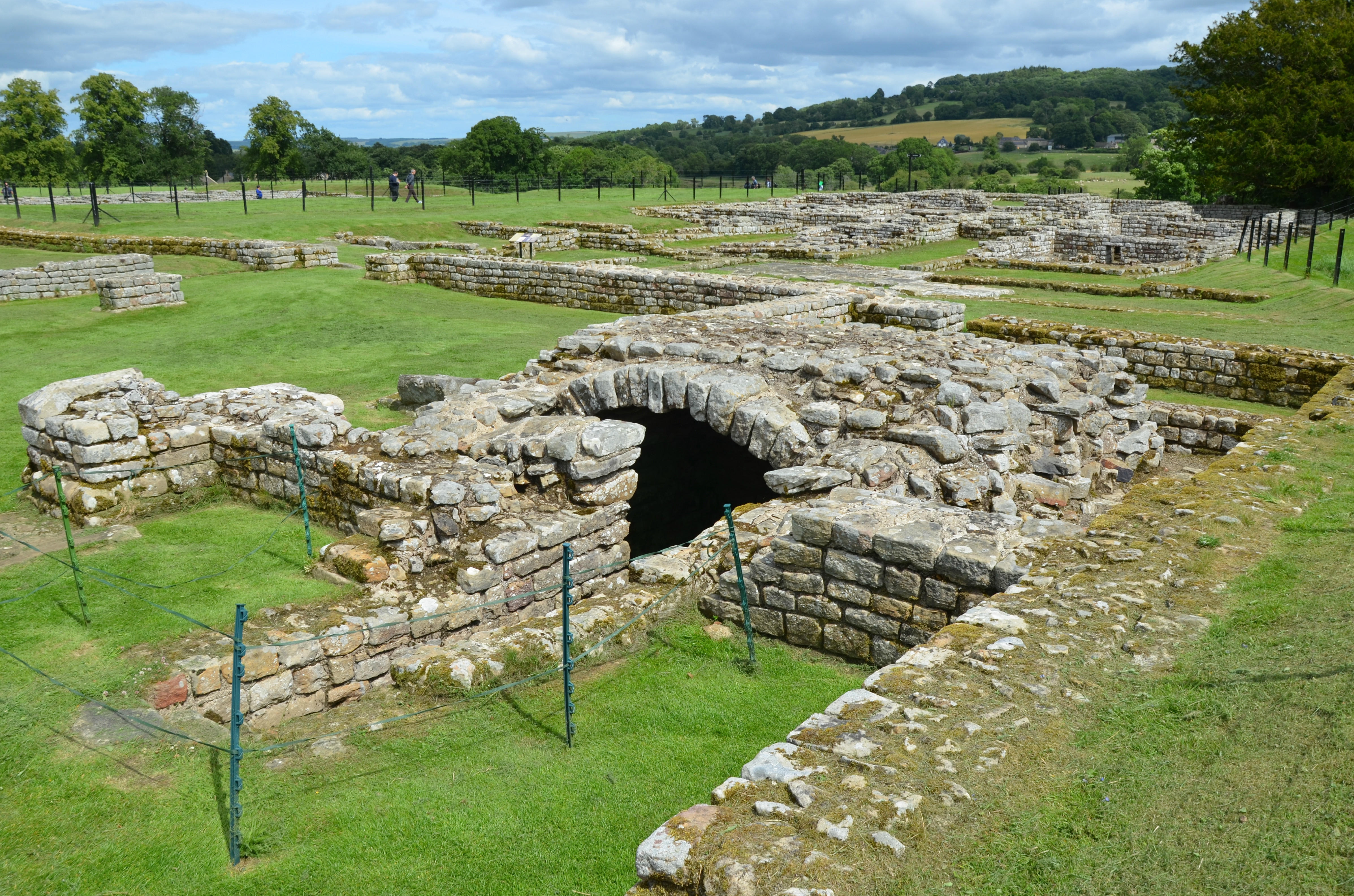 The remains of the central headquarters building (principia) of Chesters Roman Fort dating from the reign of Hadrian (r. 117-138 CE). The headquarter building occupied the central place in the fort. It was built around a paved courtyard surrounded by colonnades. The principia formed the administrative heart of the fort, where the standards of the regiment were laid up.