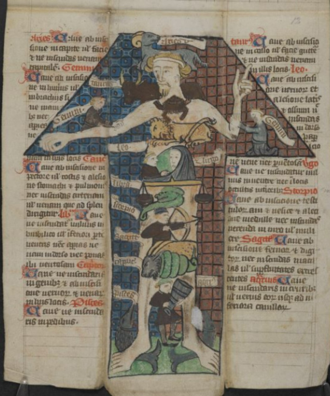 Zodiac man diagram from a 15th-century physician's almanac from England, Sloane MS 2250, f12r. The diagram shows the zodiac signs that were believed to influence various parts of the body in the Middle Ages.