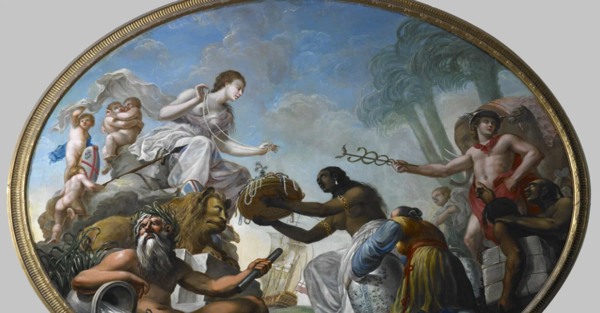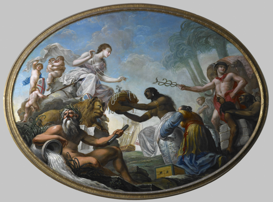 A 1778 allegorical painting commissioned by the East India Company showing the riches of the East being presented to Britannia. Painted by Spyridon Romas. The goods shown include tea, porcelain, and jewels. (British Library, London)