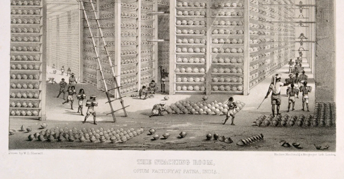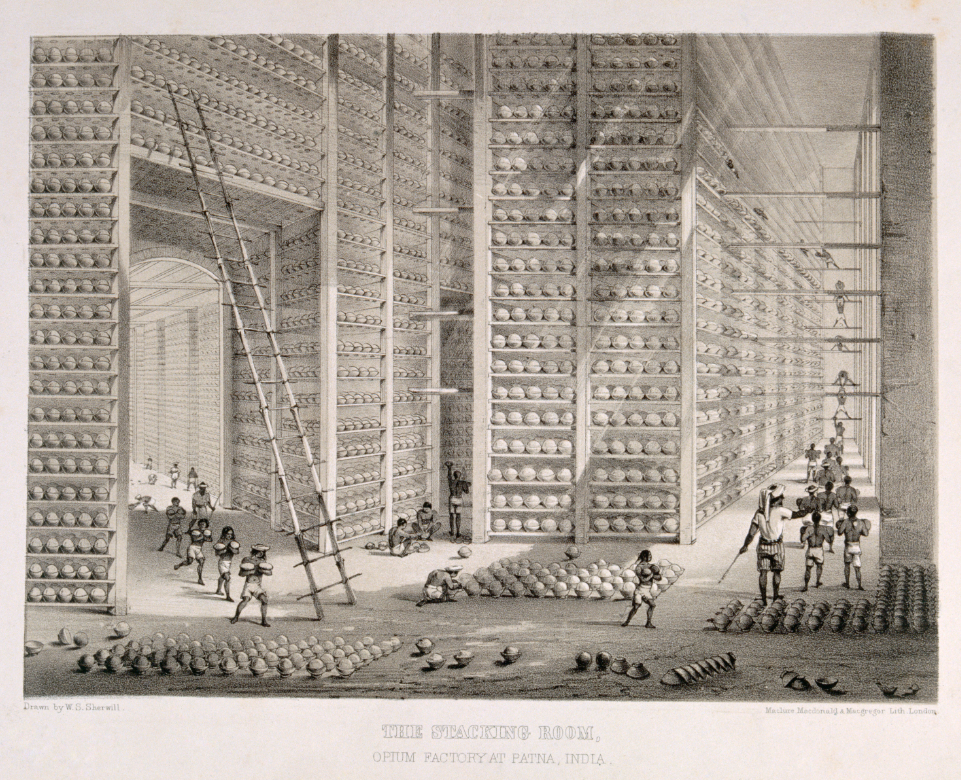 A c. 1850 print showing an opium warehouse of the East India Company in Patna, India. Opium was dried into large balls and then packed into chests for transportation to China.