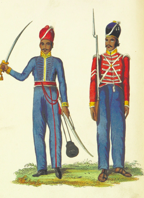 An 1839 illustration showing a trooper and sepoy (Indian recruit) of the East India Company army. 27th Regiment of Madras Native Infantry. (British Library, London)