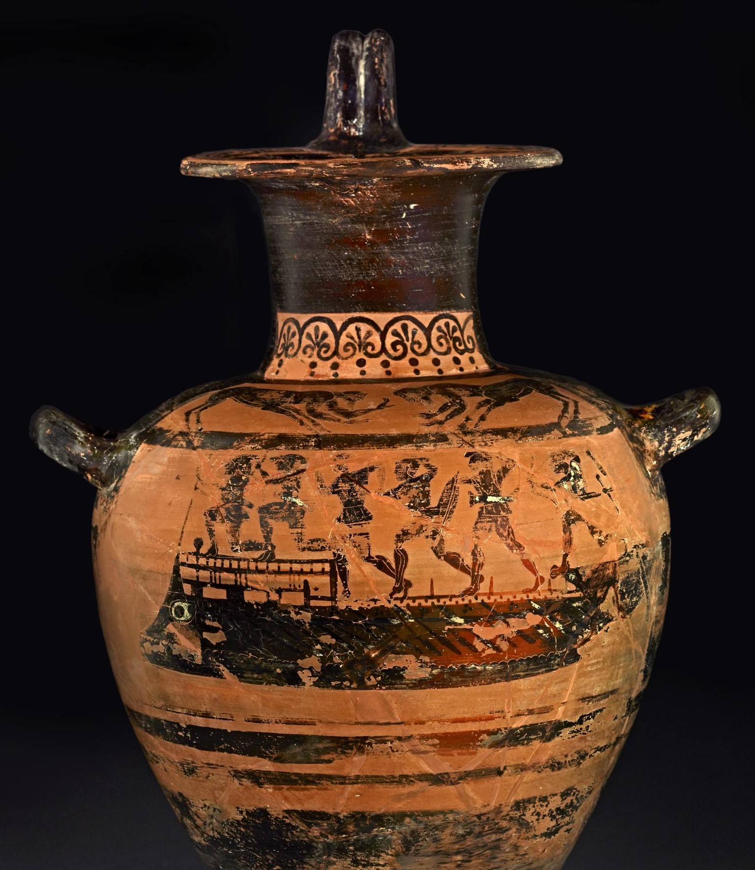 This Italiote reproduction of the Greek naval invasion of Troy based on the Iliad is shaped around a bireme (diiris), the Greek Archaic warship invented sometime prior to the 6th century BCE and continued to be in use way into the Roman era. The typical bireme, developed from the earlier 30-meter long penteconter (fifty-oared), was at least 50 m longer but relatively narrower to increase the swiftness and speed and to make it difficult for enemy troops to jump on board in clusters. The elongated shape of the bireme made it distinctive from round-shaped cargo ships. As represented on this vase, each bireme was manned by hoplites and archers with the relative frequency of 4:1 or 5:1. Biremes were decorated by massive staring eyes near the stern and a zoomorphic ram, here a boar's head, crowning the bow to strike and sink enemy ships. In the first half of the 6th century BCE, a wider model of the bireme, samaina, was invented on the island of Samos under Polycrates (r. 539-522 BCE). Unlike the battleship bireme that had rails and no decks, samaina ships lacked the rail and were covered up by a bow-to-stern deck. These features made them suitable for both warfare and trade thanks to their covered-up and capacious hull.