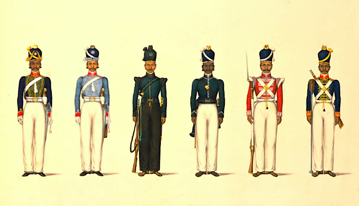 A c. 1830 illustration by Yellapah of Vellore showing six Sepoy uniforms of the East India Company Madras army.
