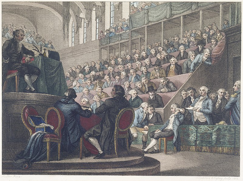 The trial of King Louis XVI of France, on 26 December 1792, engraving by Reinier Vinkeles, c. 1793-96. Louis himself can be seen prominently in the lower right, holding a sheet of paper from which he reads his defense. He is flanked by his defense counsel: Romain Deseze to his left and Malesherbes to his right. In the first row of the gallery, Maximilien Robespierre wears a green coat, glaring angrily in the direction of the king. In the third row of the gallery, Thomas Paine sits wearing a top hat with his hands nervously clasped, while Georges Danton looks on beside him. In the same row, Maximilien's brother, Augustin Robespierre, leans over to get a better look at the disgraced king. Meanwhile, Jacques de Chapelieres sits on the raised dais on the left of the engraving, moderating the debates.
