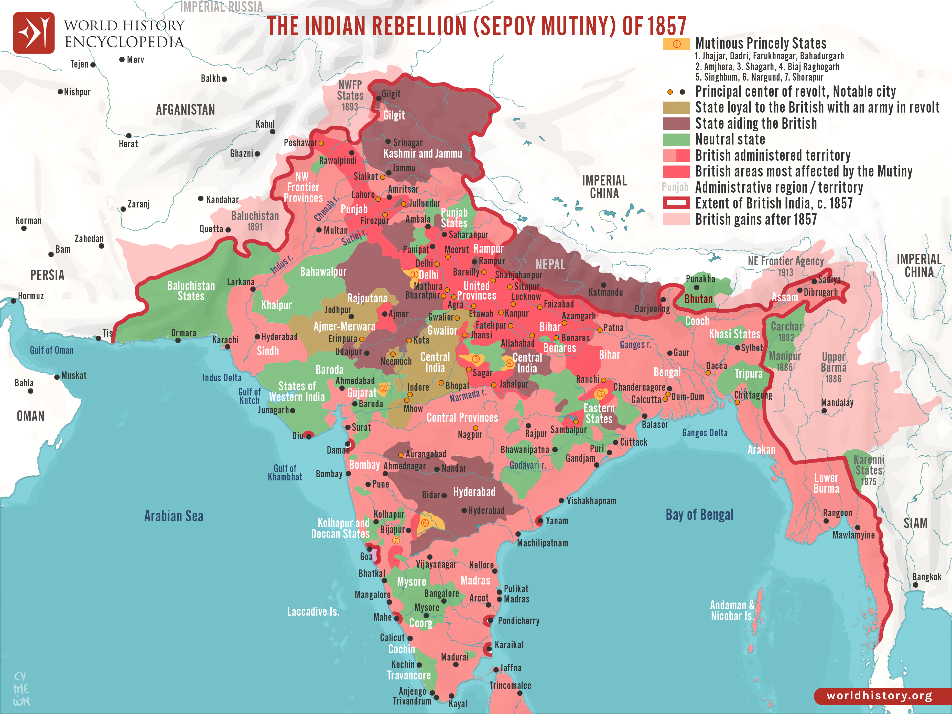 Netchev, Simeon. "Map of the Indian Rebellion (Sepoy Mutiny) of 1857." World History Encyclopedia, 07 Oct 2022, https://www.worldhistory.org/image/16491/map-of-the-indian-rebellion-sepoy-mutiny-of-1857/.