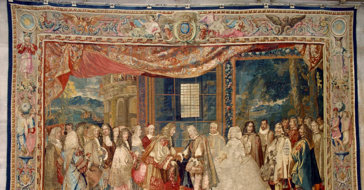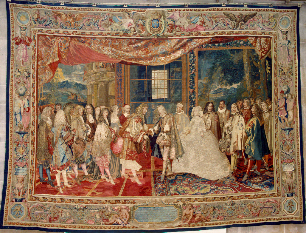 A tapestry showing an event during talks in relation to the Treaty of the Pyrenees, and the proposed marriage of Louis XIV and the Spanish Infanta. Paris, 1668, tapestry (high warp), silk, wool, gold thread.