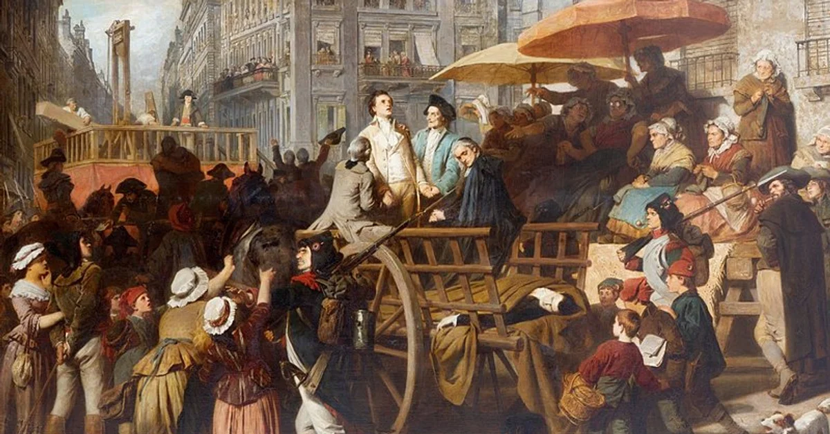 Following their arrest on 2 June and their kangaroo court trial, 22 Girondin leaders are borne in a tumbril to the guillotine on 31 October 1793, during the Reign of Terror. In a final act of defiance, they sing the revolutionary anthem La Marseillaise as they are executed one by one.