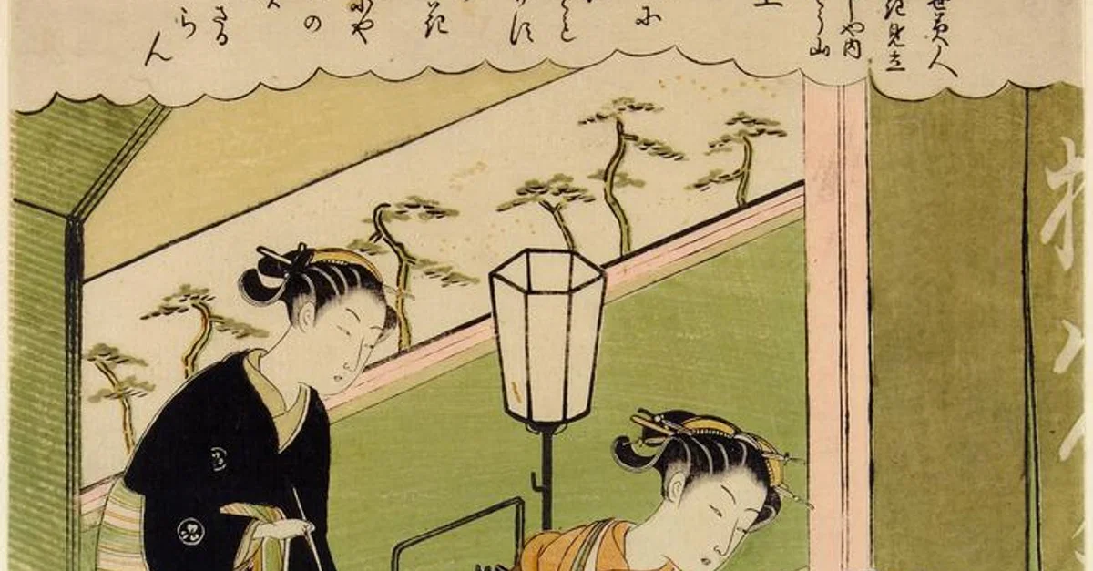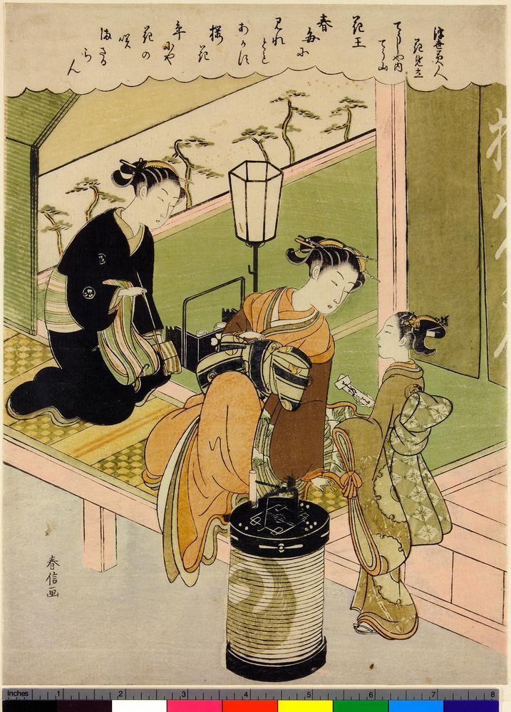 Woodblock print depicting the courtesan Chojiya-uchi Chozan with her young attendant (kamuro) and friend preparing to smoke, by Suzuki Harunobu, Japan, 1765-1770.