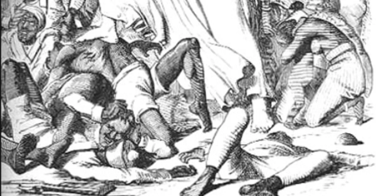 A cartoon from Punch magazine parodying the British suppression of the Sepoy Mutiny in India of 1857-8. Cartoon by John Tenniel, 1857.