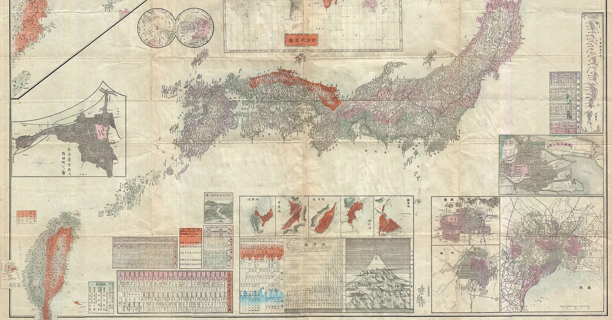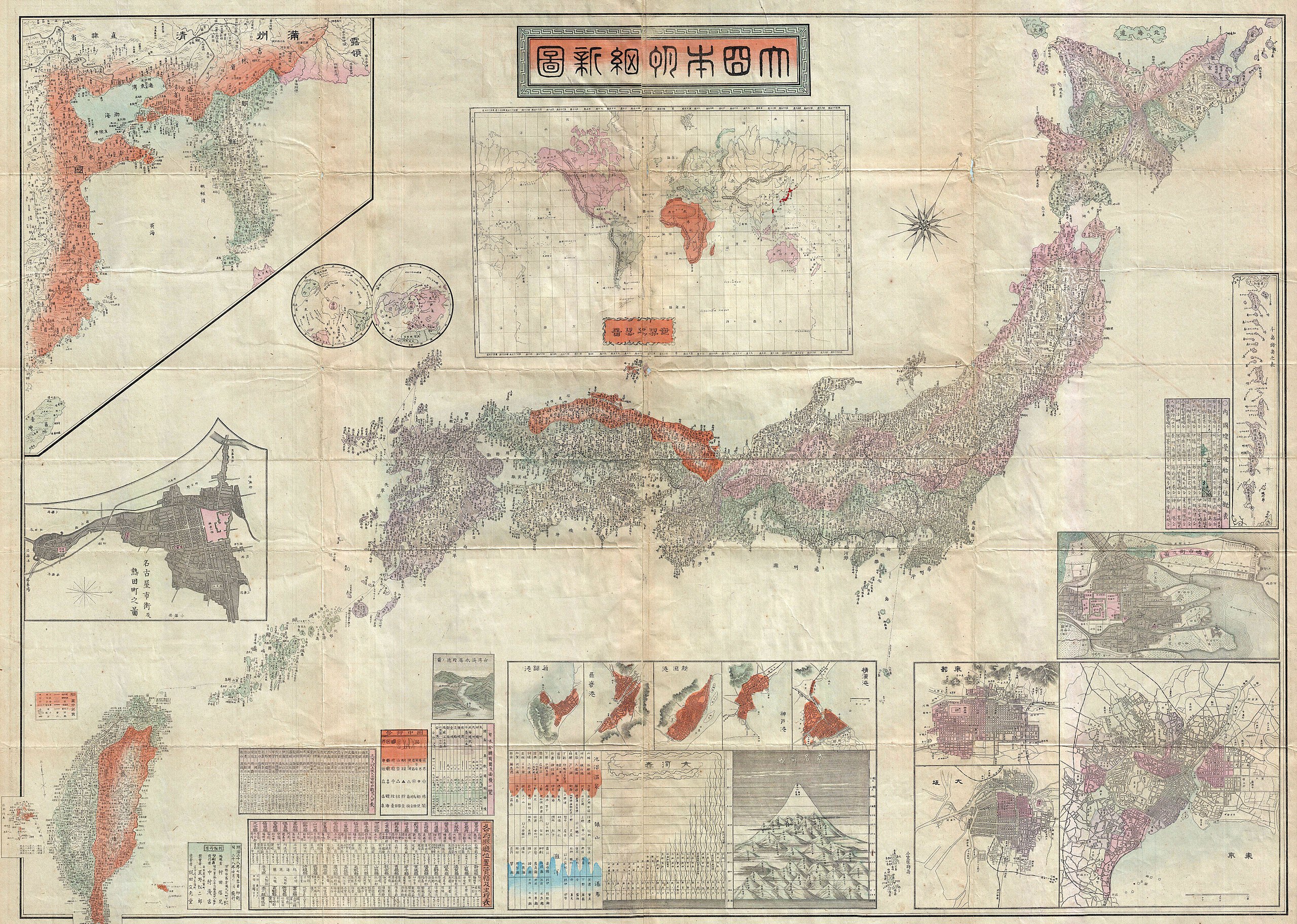 Map of the Japanese Empire, 1895. It was issued shortly after the 1895 Japanese invasion of Taiwan and is consequently one of the first Japanese maps to include Taiwan and Korea as provinces of Imperial Japan.