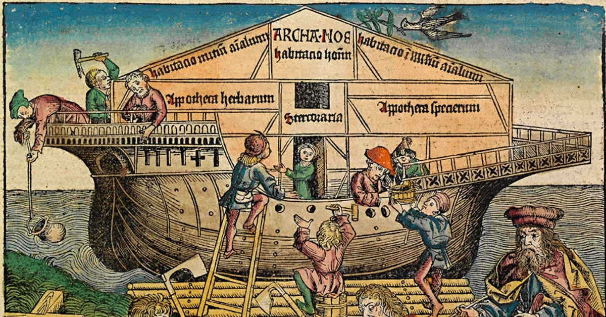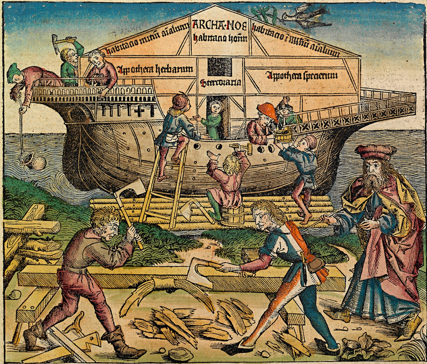 A 1493 illustration from the Nuremberg chronicles showing the construction of Noah's Ark.