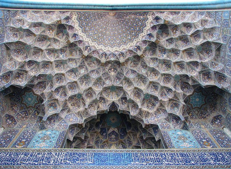Decorative muqarnas vaulting in the iwan entrance to the Shah Mosque, Isfahan, Iran.