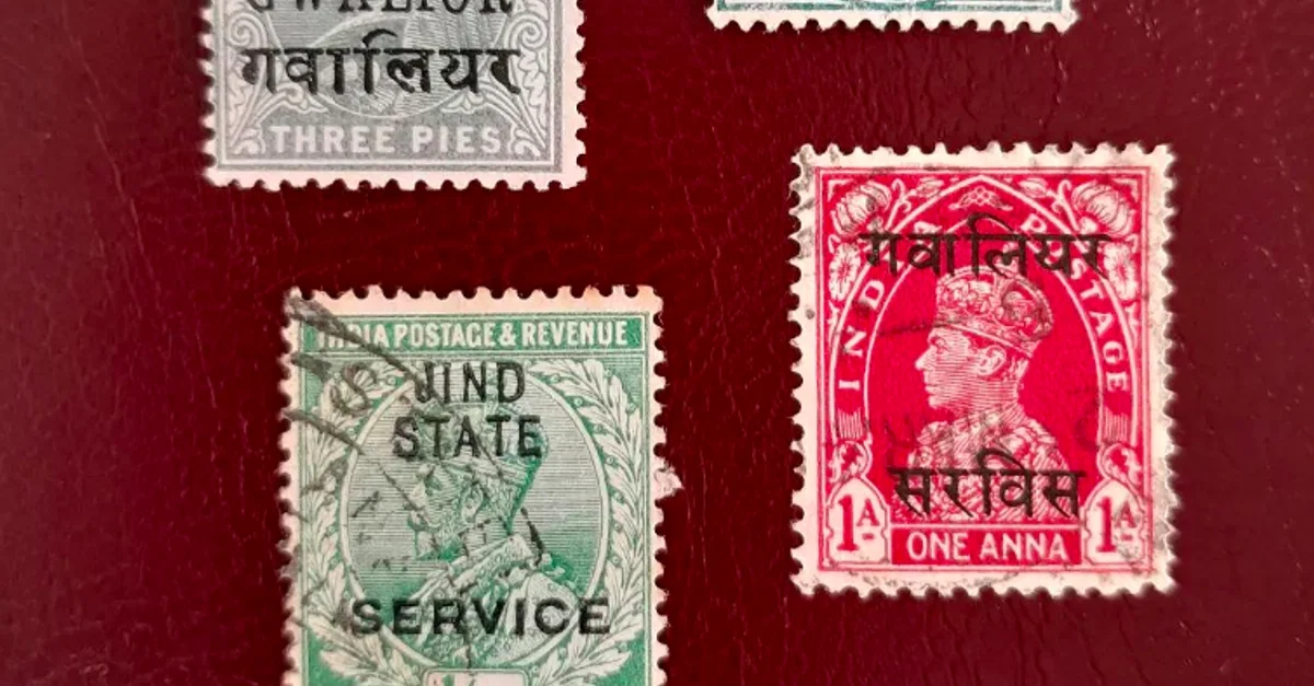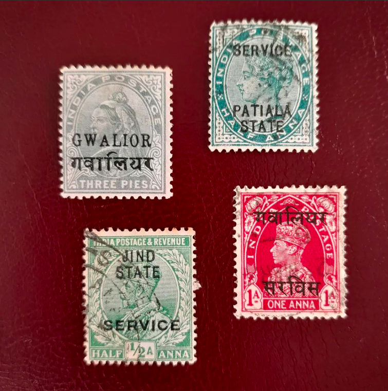 Four examples of British India postage stamps issued with overprints for use in particular Indian princely states.