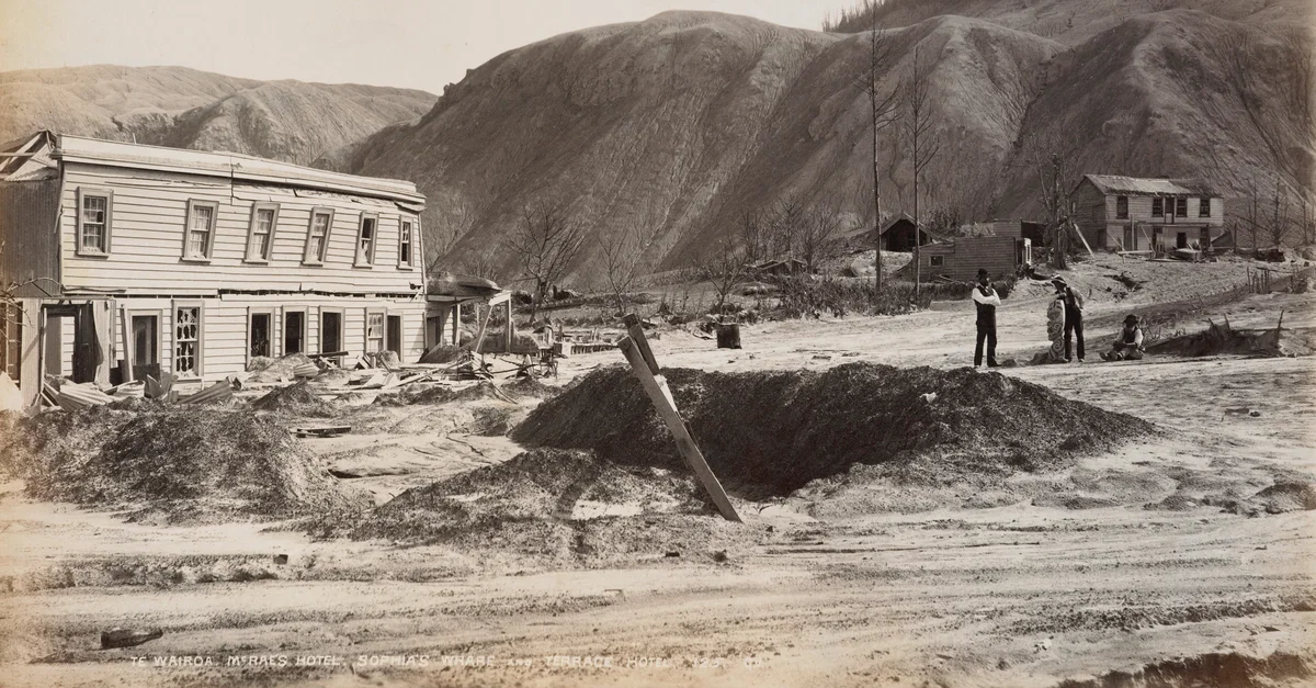Photograph taken by photographer, George Valentine (1852-1890), showing the destruction wrought by the eruption of the volcano, Mount Tarawera (New Zealand) in June 1886. The image shows what was left of the Rotomahana Hotel owned by Joseph McRae (1849-1938), a whare or Maori hut, and the Terrace Hotel. From the collection of the Museum of New Zealand Te Papa Tongawera.