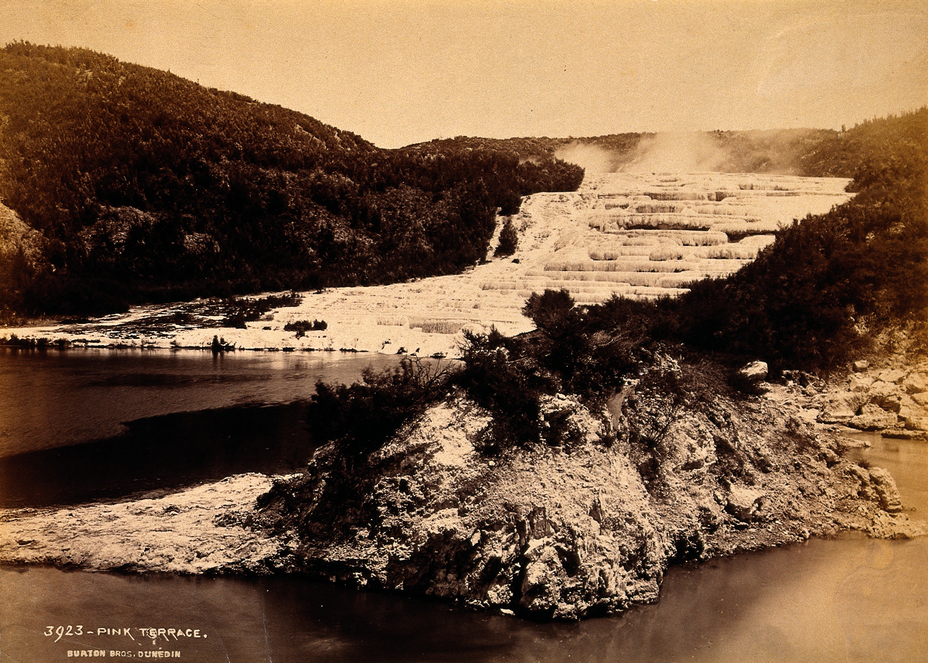 Photograph showing the famed pink and white terraces of New Zealand and the terraced thermal pools on the edge of Lake Rotomahana. Photograph taken by Burton Bros (1866–1914) of Dunedin. The terraces were destroyed in 1886, following the eruption of Mount Tarawera.