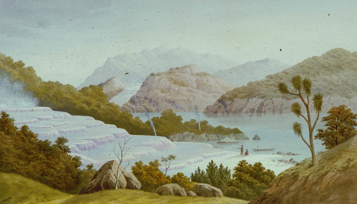 Painting by John Hoyte (1835-1913) of the world-famous pink and white terraces of New Zealand that were destroyed by volcanic eruption in 1886.