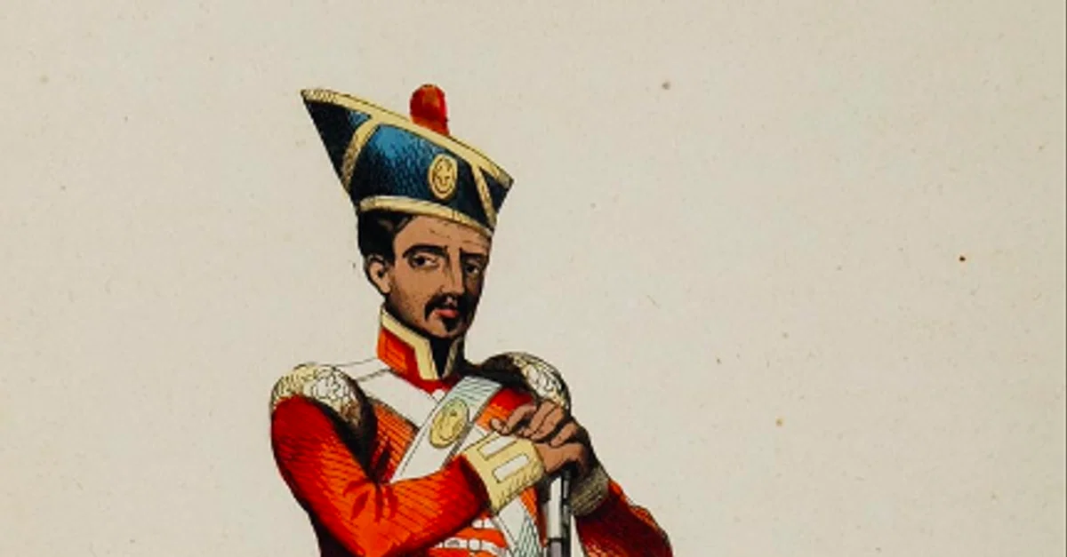 A mid-19th-century illustration showing the typical uniform of a sepoy in the East India Company army - red jacket, shorts, and a variation on the traditional turban.